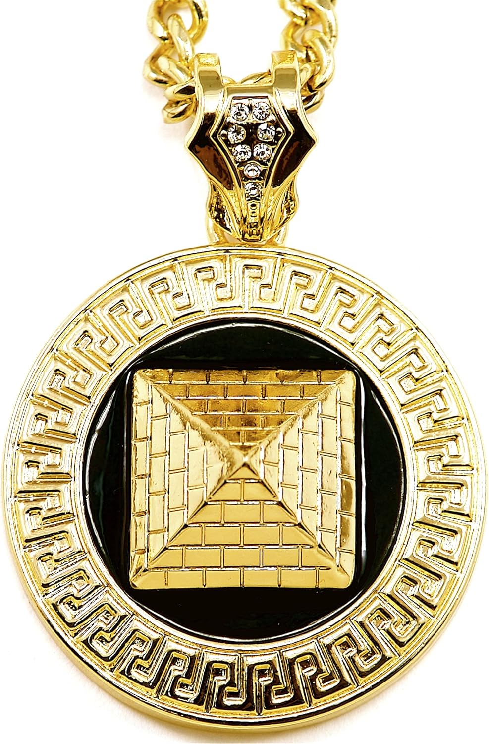 Pyramid Egyptian Gold Color With Black Laquer Pendant Necklace. Gold color 8mm wide Cuban link style 36 inch long chain with lobster claw clasp. Pendant measures 1 3/4 inches in diameter. Each individually wrapped from factory. Your satisfaction is our priority.